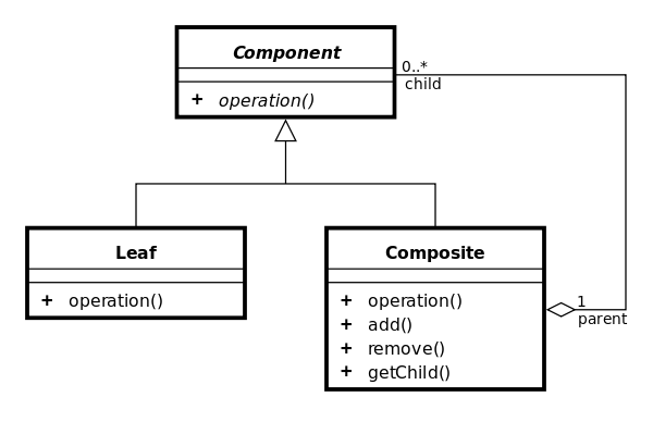 }In this example, the Component class defines common methods for leaf and composite objects. The Leaf class represents a single object in a tree structure, while the Composite class represents a composite object that can contain one or more children. The Composite class implements the common methods of the Component class and provides additional methods for managing child components, such as adding or removing them. This feature allows client code to treat leaf and composite objects uniformly, making it easy to manage object hierarchies.