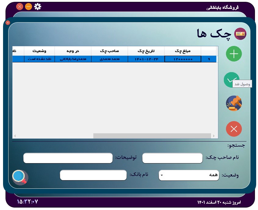 علاوه بر بدهکاران، این برنامه شامل قسمتی است که میتوان چک های وارده و صادره را ثبت کرد. مدیر فروشگاه می توانند جزئیات چک مانند نام صاحب چک، نام بانک و مبلغ را ثبت کند. پس از ثبت چک، برنامه بصورت خودکار یک یادآوری برای چک ثبت میکند و در روز مقرر به مدیر نمایش میدهد.