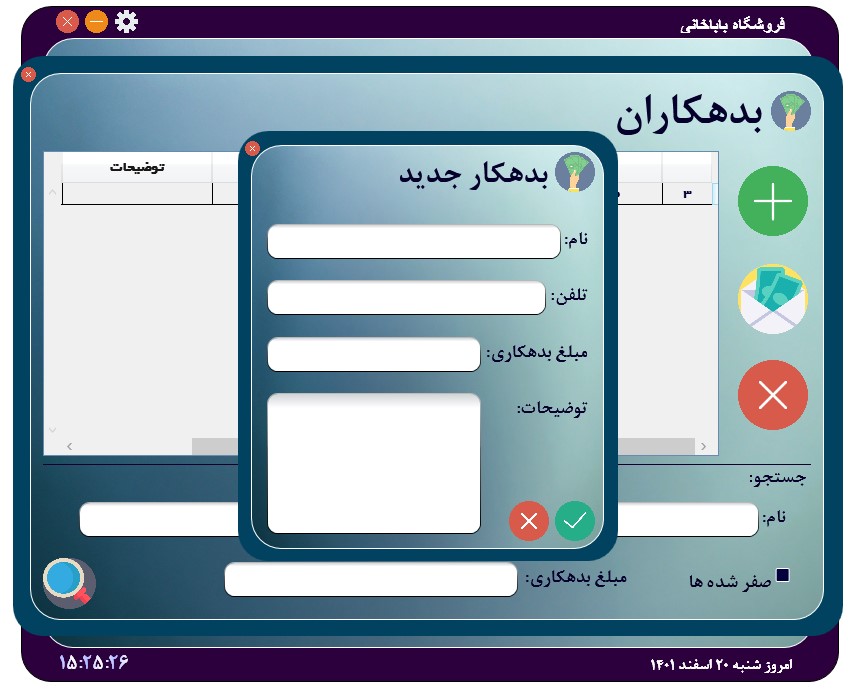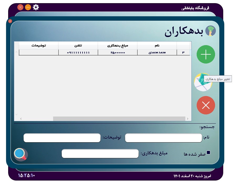 این برنامه دارای قسمتی جهت ثبت بدهکاران است. مدیر فروشگاه میتواند بدهکاران را ثبت کرده و روند تصویه حساب را پیگیری کند.