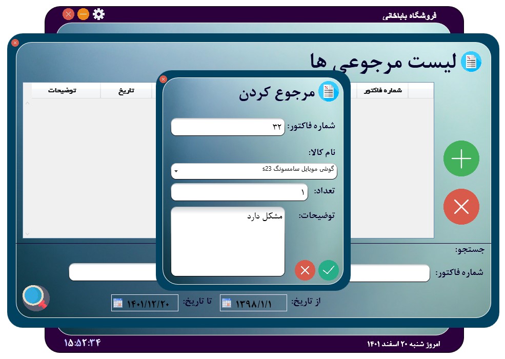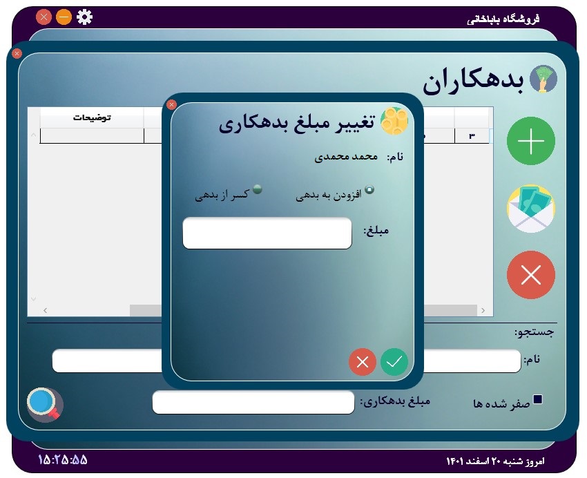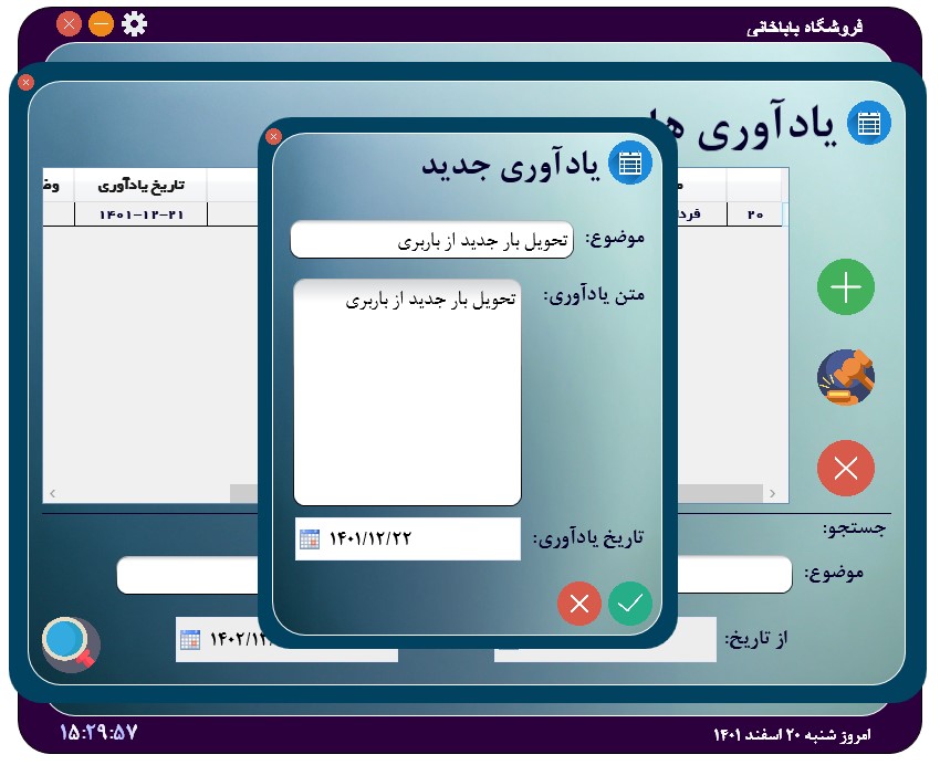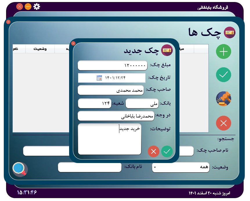 In addition to debtors, this program includes a section where incoming and outgoing checks can be recorded. The store manager can record check details such as name of check owner, bank name and amount. After registering the check, the program automatically registers a reminder for the check and displays it to the manager on the scheduled day.